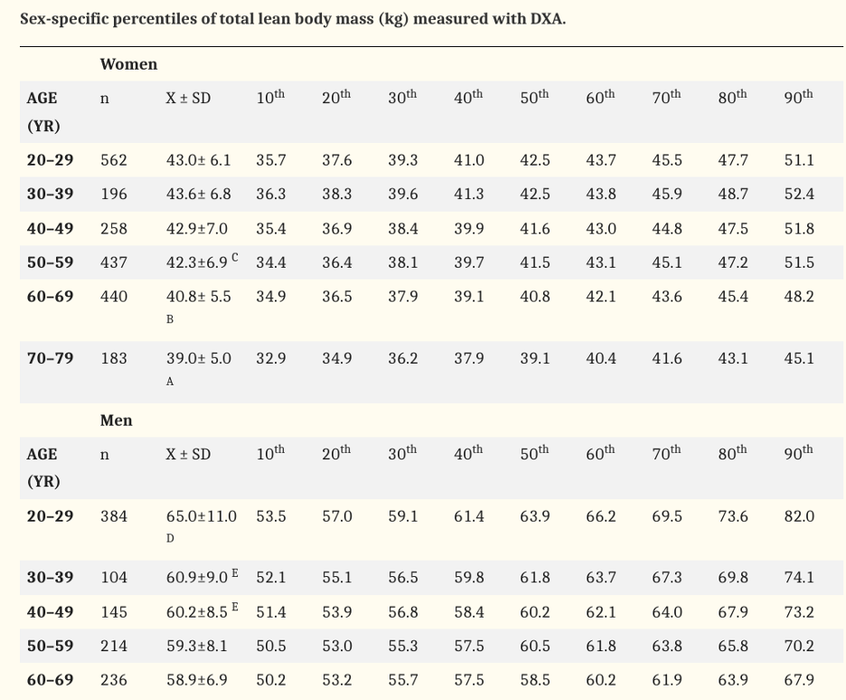 For clarity, I just want to highlight that this chart utilizes total body lean mass (in kg’s) measured with DEXA and the Rotterdam study used lower limb lean mass (in kg’s) only.  When you get a DEXA scan it will provide both limb specific lean mass and total lean mass.