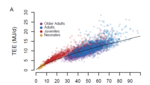 Here is a graphical interpretation of the human population’s total energy expenditure throughout their lifetime (age on the X axis and total energy expenditure is on the Y axis). Note how remarkably consistent it stays from age 20 through age 60.