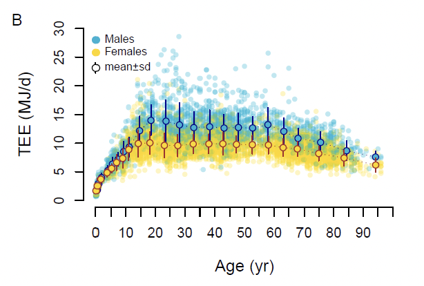 Here is a graphical interpretation of the human population’s total energy expenditure throughout their lifetime (age on the X axis and total energy expenditure is on the Y axis). Note how remarkably consistent it stays from age 20 through age 60.