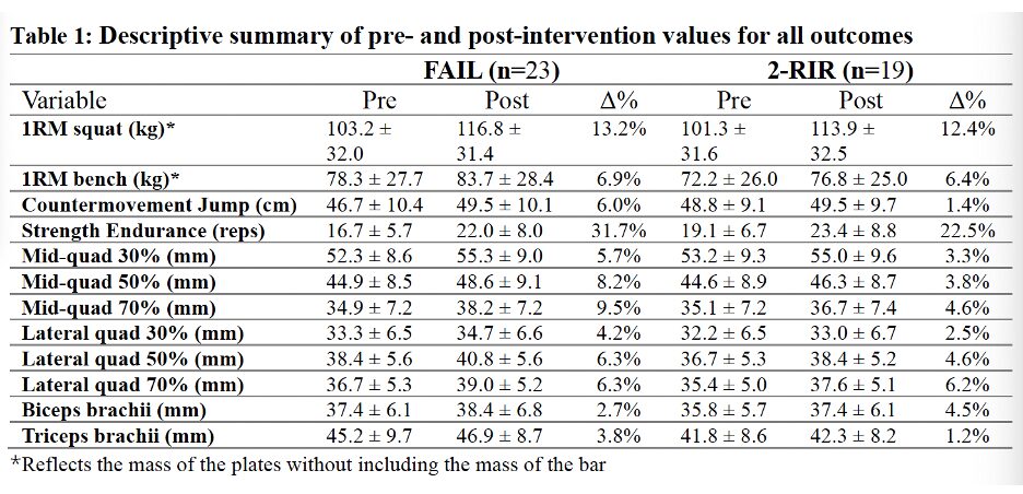 The study took 50 university aged people, and randomized them to either a train to failure group or a 2 reps in reserve group.  They then put them through a general upper and lower body resistance training program just two times per week for 8 consecutive weeks.