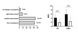 After 9 weeks 86.9% of the patients who completed the exercise protocol were completely free of symptoms or had very minor symptoms.  Pretty darn good odds of success!  On average pain scores (PR) were cut by more than half and impact of mental health (IOMH) scores benefited to an even greater degree after the 9 week protocol.