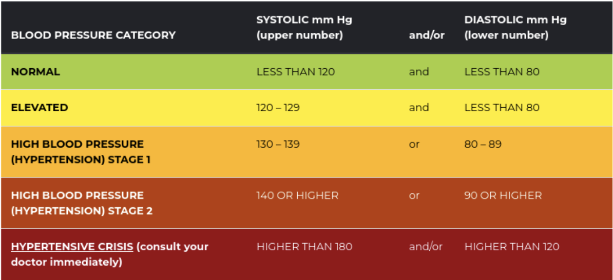 The American Heart Association categorizes the ranges for normal, elevated, Hypertension Stage 1, Hypertension Stage 2 and Crisis as follows:
