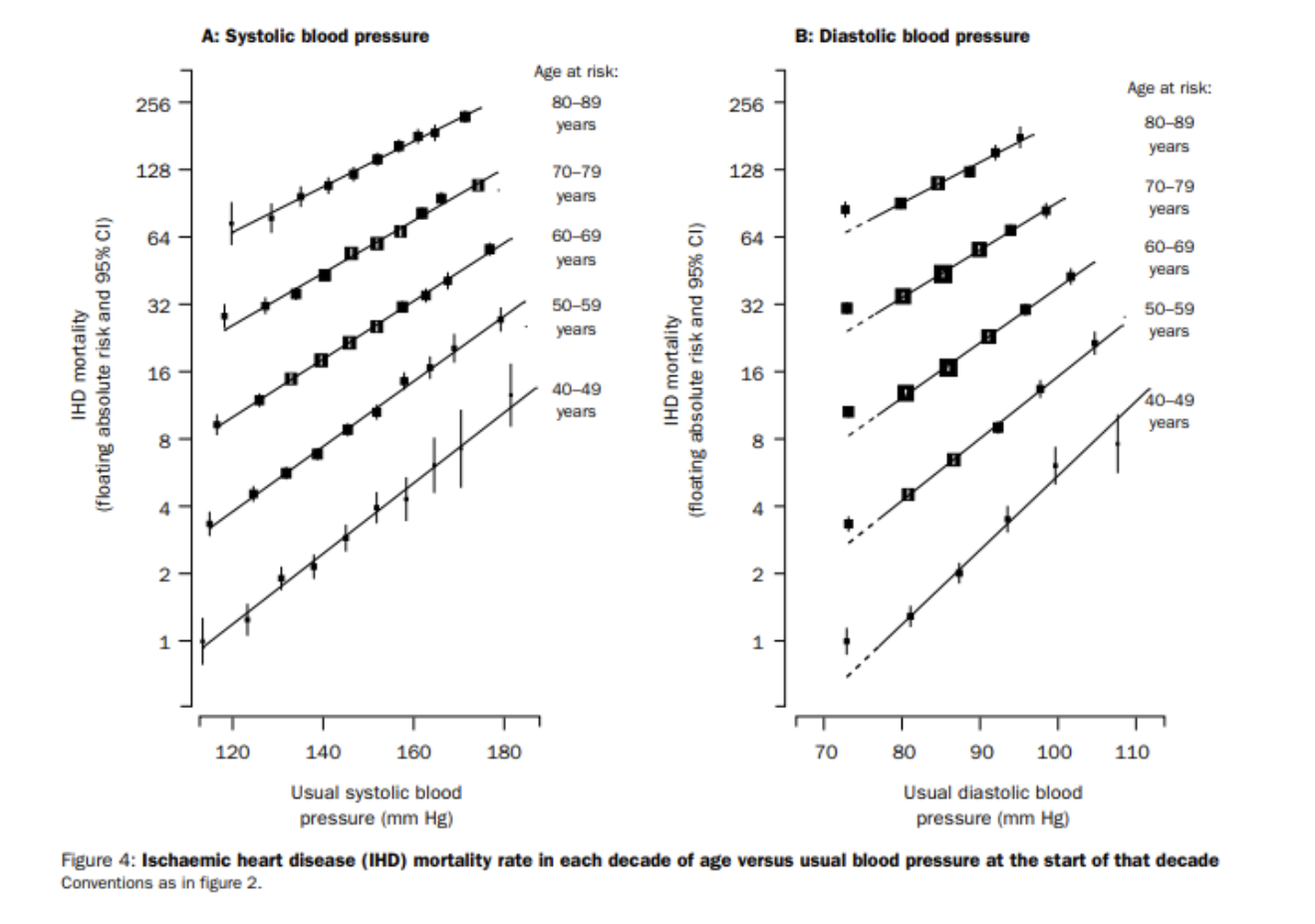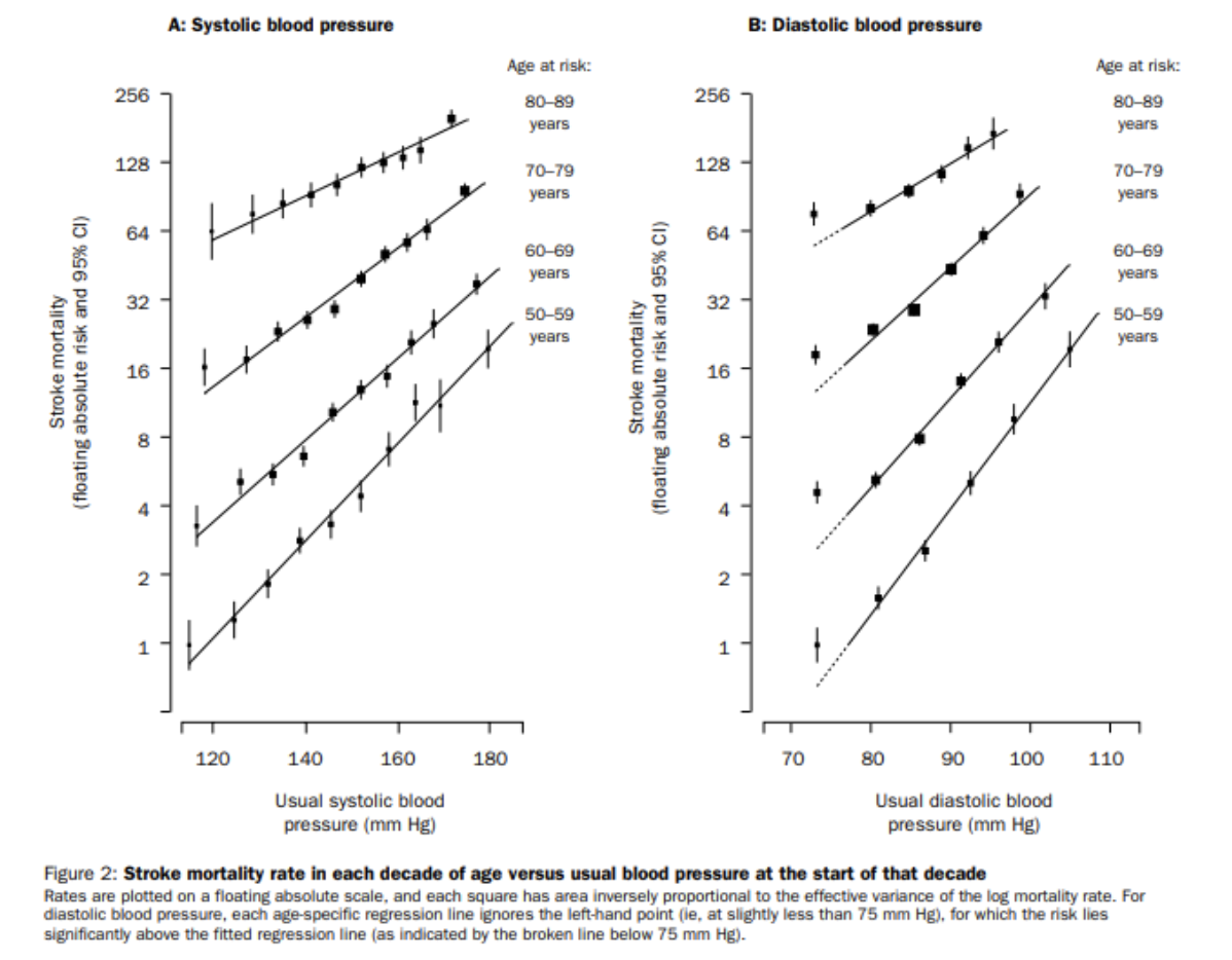 A large meta analysis published in 2002 with data taken from 61 prospective observational studies involving one million adults with no previous vascular disease showed an almost linear reduction in stroke risk and ischemic heart disease with lower systolic and diastolic blood pressure.  This decreased risk with decreased blood pressure was apparent in each decade age 40 to age 80.