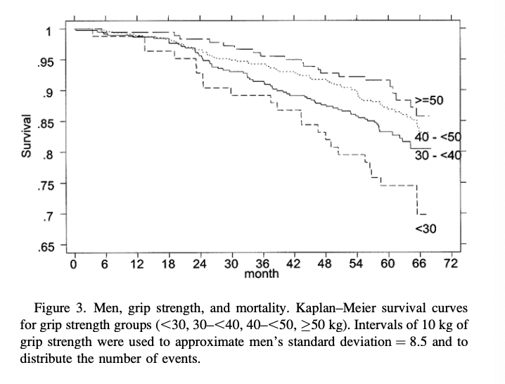 Confused? I was. Essentially that means that despite losing muscle mass (and subsequently gaining adipose or fat mass), provided the person kept their grip strength up, their survival rate was unchanged!