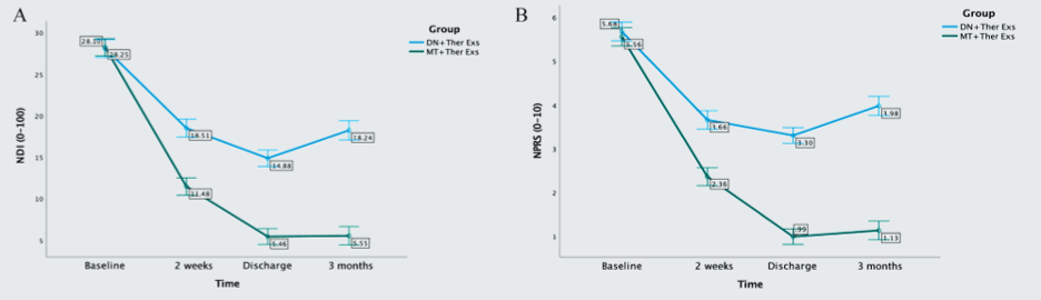 Graph A shows the functional improvement using the neck disability index (NDI) and Graph B shows the improvement on pain levels using the Numeric Pain Rating Scale (NPRS).